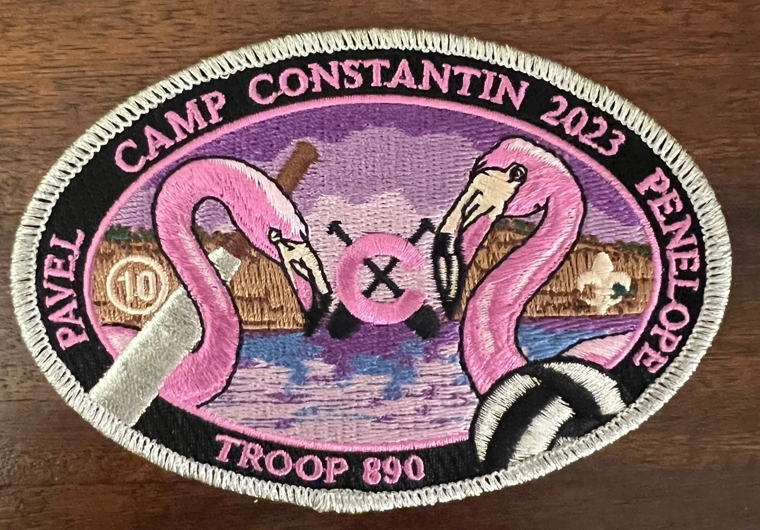 The flamingo ovals started in 2007 by then-Scoutmaster Brett Chumbley. Scroll down to the last patch in this folder, and you can see that the Camp started making Council Shoulder Patches (CSPs) in 2006 for Camp Leaders and Staff, and the design of our patch the following year also uses the Hell’s Gate backdrop but with our flamingos.